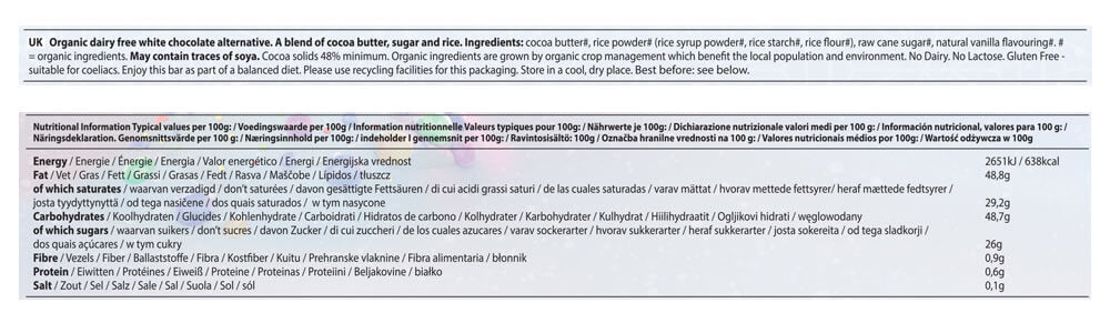 Zutaten: Kakaobutter, Reispulver, Roh-Rohrzucker, Vanilllearoma