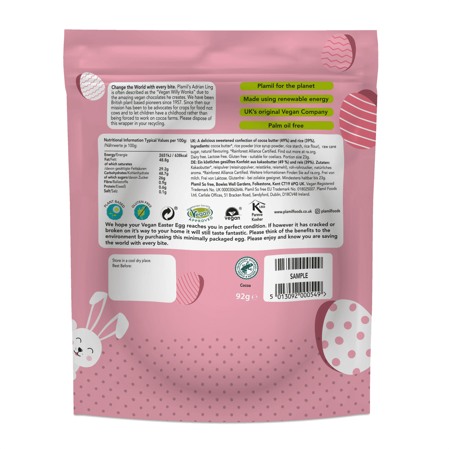 Dieses milchfreie Milchschokoladen-Osterei mit Beutel wird in der Plamil-eigenen Fabrik hergestellt, die niemals Milch oder Gluten verwendet.