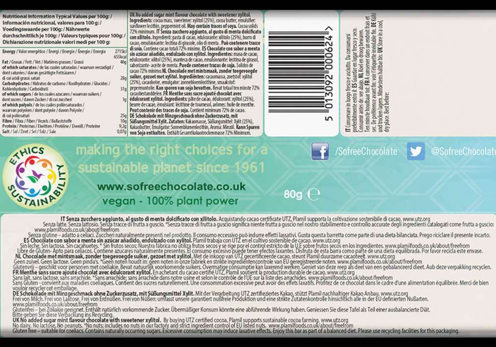 So Free - Dunkle Schokolade Xylit ohne zugesetzten Zucker - Pfefferminze. Nussfrei, laktosefrei, glutenfrei, vegan, 72% Schokoladenanteil
