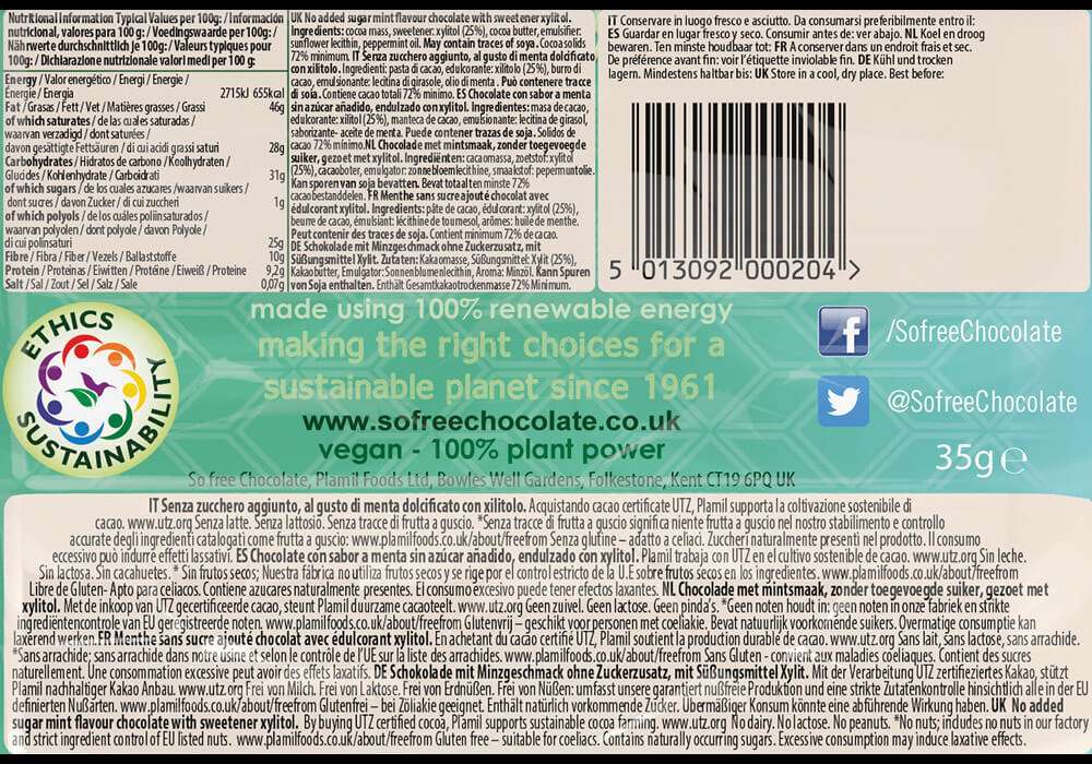 So Free - Dunkler Schokoladen-Snack Xylit ohne zugesetzten Zucker - Pfefferminze. Nussfrei, laktosefrei, glutenfrei, vegan, 72% Schokoladenanteil