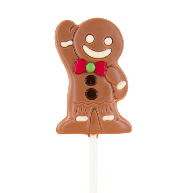 Milchschokolade Lebkuchenmann-Lolly, 32% Schokoladenanteil. Nussfrei, glutenfrei, eifrei, sojafrei.