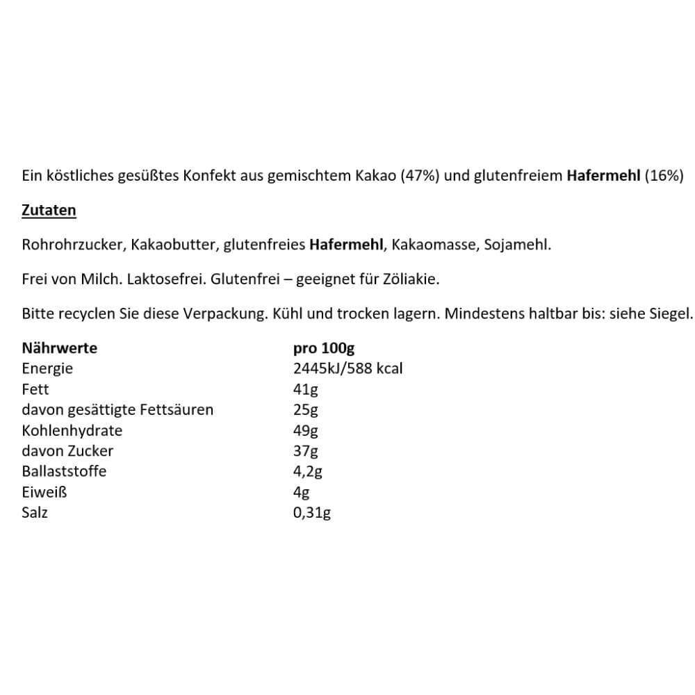 Ein köstlich süßes Konfekt aus gemischtem Kakao (47%) und glutenfreiem Hafermehl (16%)