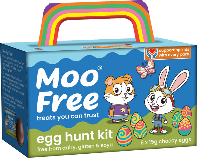 Moo Free Egg Hunt Kit aus veganer Schokolade. Nussfrei, laktosefrei, glutenfrei, hefefrei, vegan, sojafrei